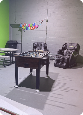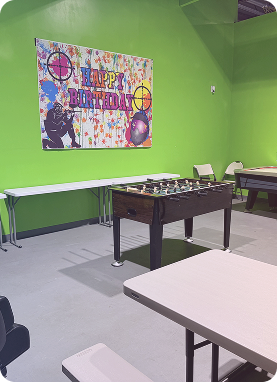 The Birthday Party Room at Steeltown is your party headquarters — a dedicated space for food, gifts, breaks, and celebrating between games. It keeps your group organized, energized, and having fun while we handle the schedule, setup, and gameplay
