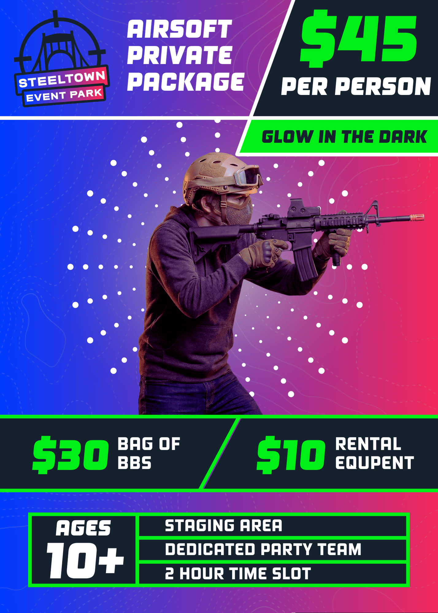 Includes 2 slices of pizza, bottle of water, and Steeltown T-Shirt