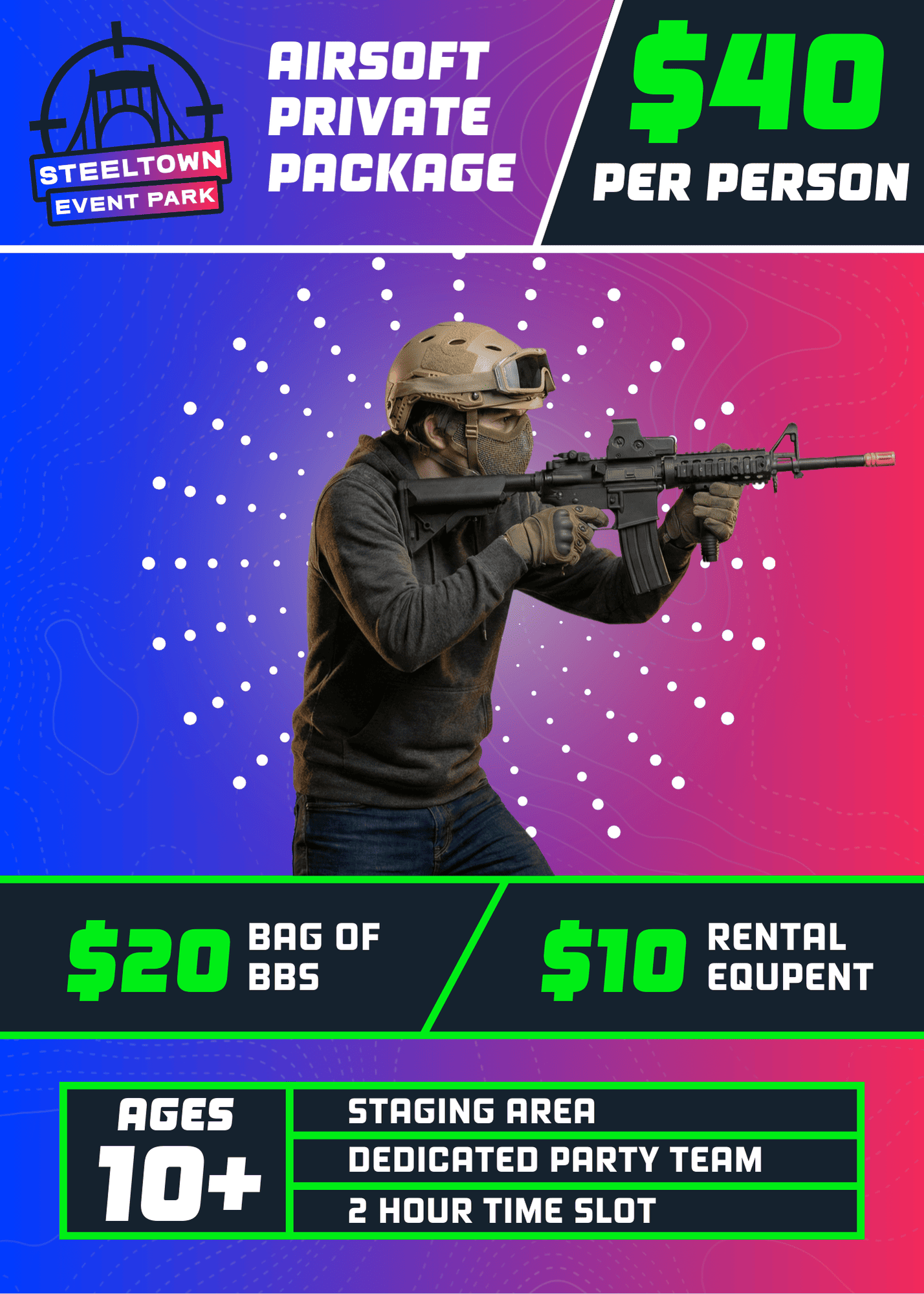 Includes 2 slices of pizza, bottle of water, and Steeltown T-Shirt